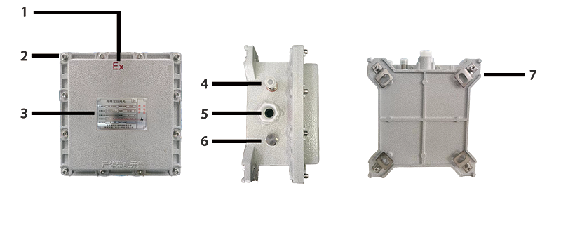 1.防爆標識 2.固定孔 3.銘牌標示 4.LoRa天線接頭 5.電源線、網線出線孔 6.4G/5G天線接頭 7.設備固定孔