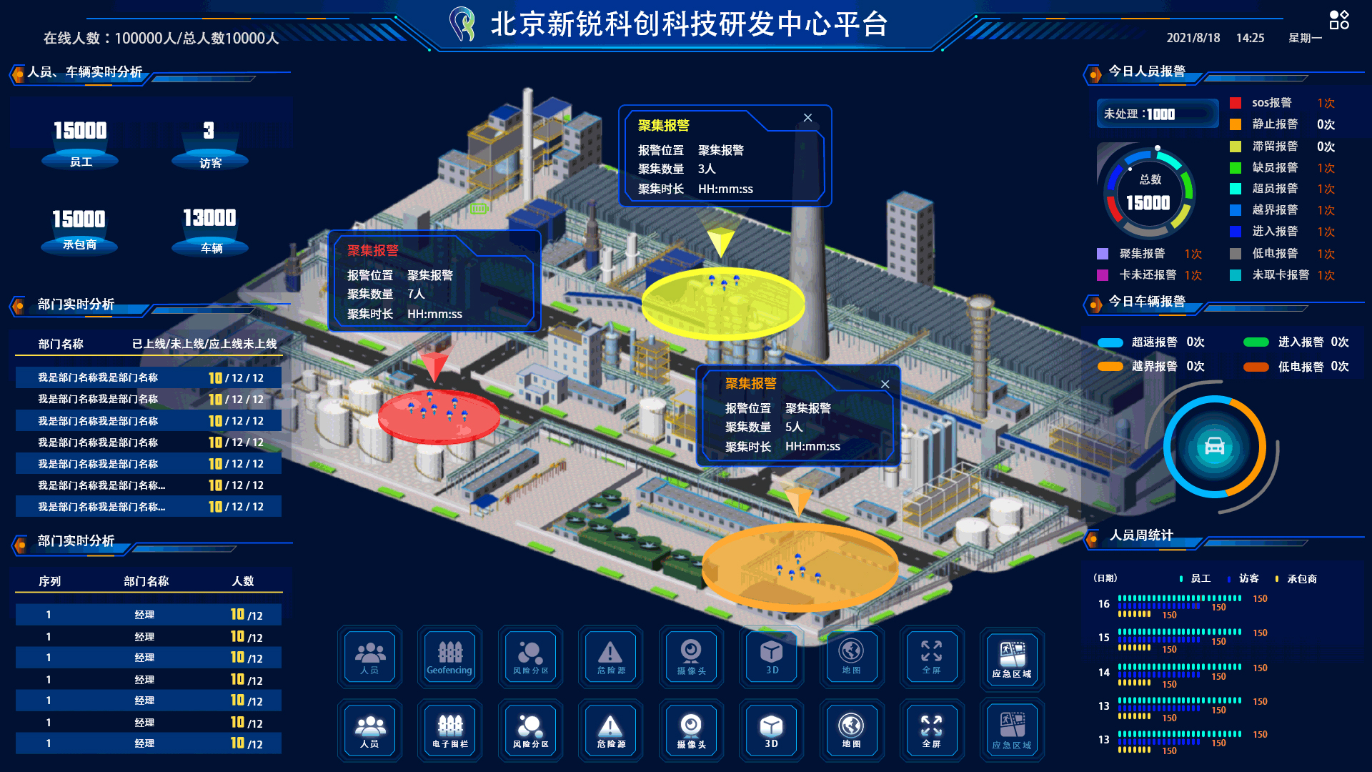 可實時展示車輛的位置信息和詳細(xì)的車輛數(shù)據(jù)統(tǒng)計。同時,能夠進(jìn)行車輛報警統(tǒng)計,記錄每次報警的具體時間、地點及原因。系統(tǒng)能對車輛的進(jìn)入、越界;超速;低電量警告;長時間滯留、違規(guī)停車等情況進(jìn)行精準(zhǔn)報警,并提供相應(yīng)的處理建議和歷史記錄查詢功能。