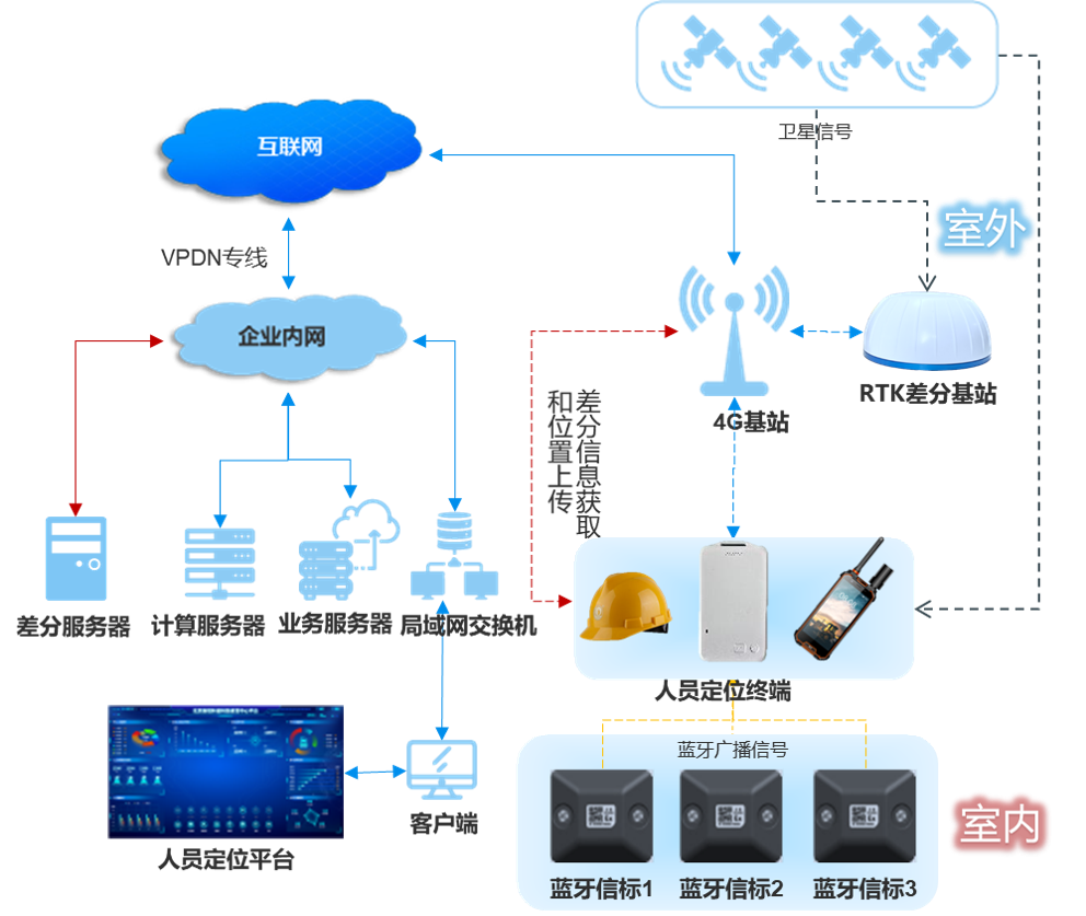 衛星定位部分:定位終端接收衛星信號,RTK差分基站也接收衛星信號,差分基站將差分信息通過4G網絡上傳到差分服務器,差分服務器實時刷新最新的差分信息;定位終端通過4G連接差分服務器,獲取最新的差分信息,終端在本地解算出自身位置后,通過4G網絡將位置信息上傳到服務器;服務器與地圖引擎進行信息處理后,在展示終端顯示人員位置。