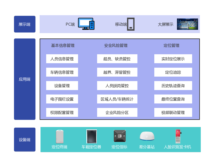 人員定位系統(tǒng)由設(shè)備端、應(yīng)用端、展示端組成,如下圖所示: